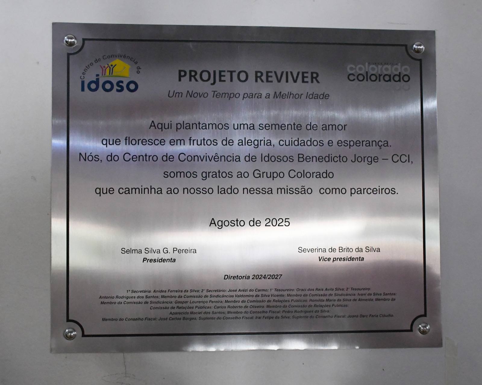 “Aqui plantamos uma semente de amor que floresce em frutos de alegria, cuidados e esperança. Nós, do Centro de Convivência dos Idosos Benedicto Jorge  somos gratos ao Grupo Colorado  que caminha ao nosso lado nesse missão, como parceiro”. Este é o agradecimento do CCI Benedicto Jorge ao Grupo Colorado inscrito na placa que marca a entrega de obras custeadas pela empresa na instituição que atende gratuitamente a idosos em Miguelópolis.