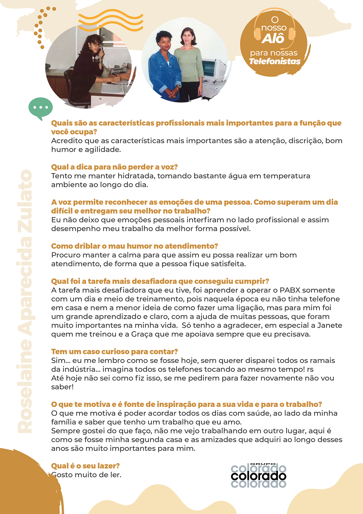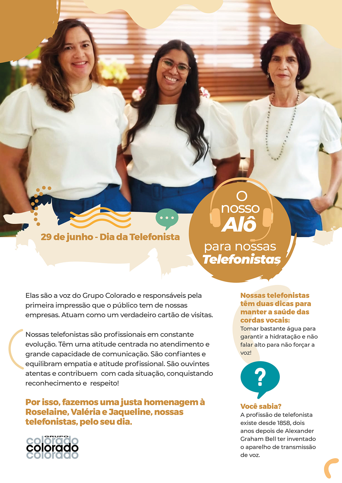 Parabéns a todas as telefonistas do Grupo Colorado, que sempre nos atendem com muita atenção, dedicação e respeito! A elas com muito carinho e admiração, forte abraço!