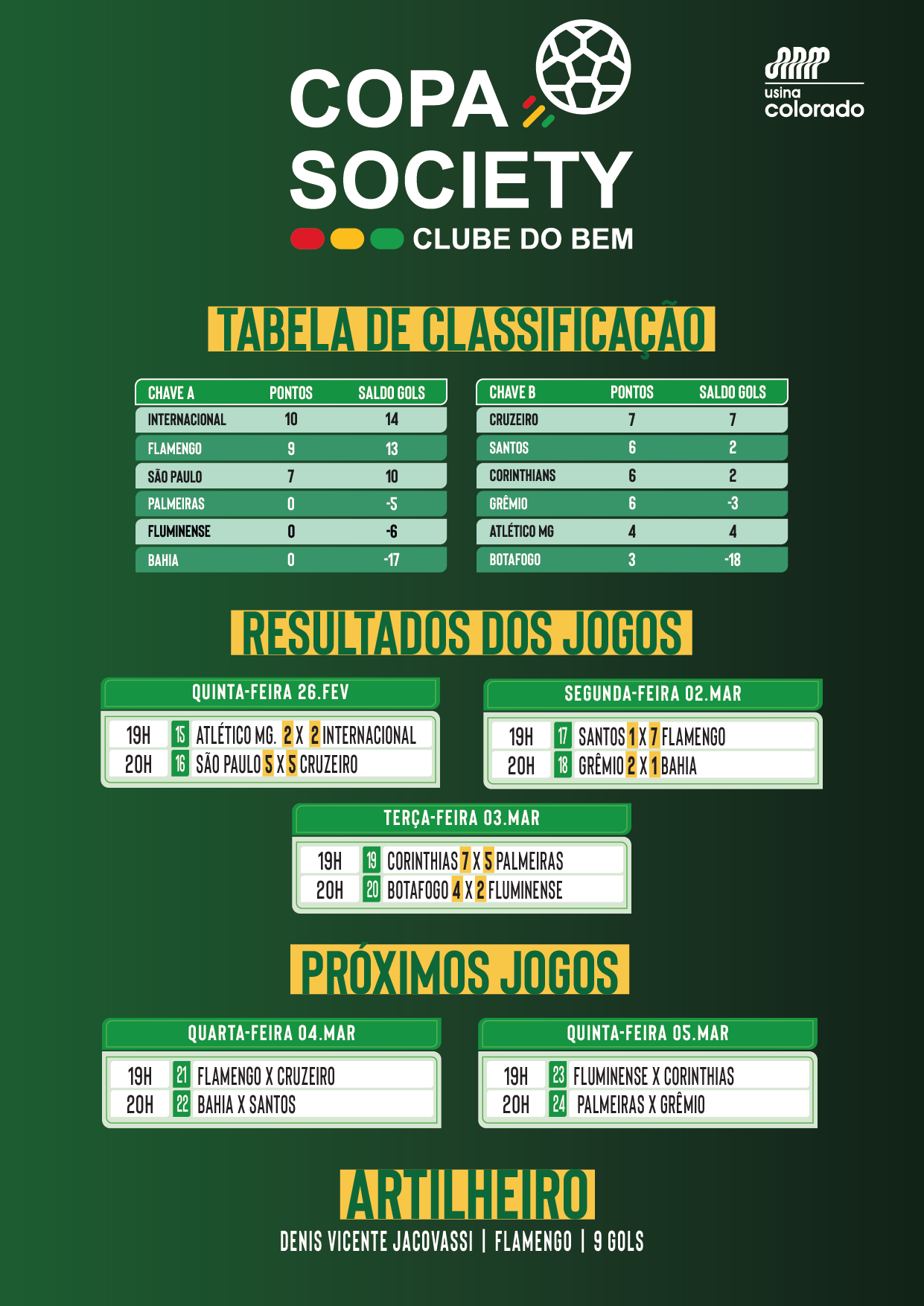O Campeonato de Futebol Society 2026 do Grupo Colorado começou no dia 02 de fevereiro e já vem movimentando o Clube do Bem com partidas disputadas e torcidas animadas. A competição acontece sempre às terças, quintas e sábados, com jogos às 19h e às 20h30, reunindo colaboradores, familiares, amigos e amantes do futebol.
