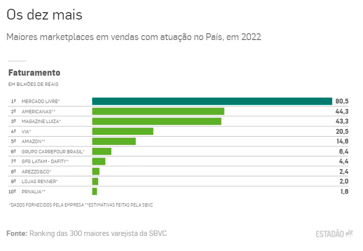 Na 9ª edição do levantamento, pela primeira vez o Mercado Livre, o maior marketplace do varejo nacional, informou o volume de vendas. A empresa, de origem argentina, que liderou a lista dos shoppings virtuais, faturou no País R$ 80,5 bilhões no ano passado.