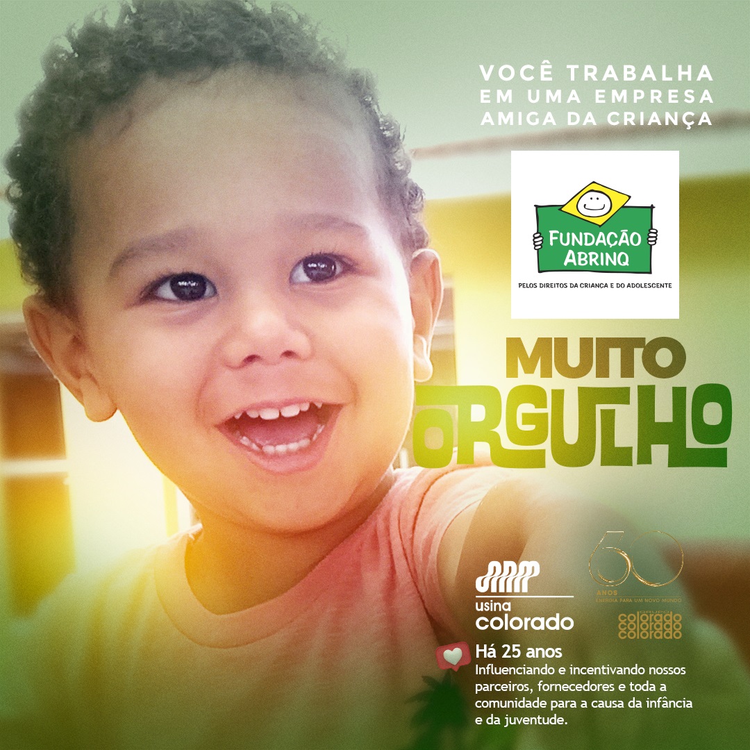 Há 25 anos a Usina Colorado é certificada pela Fundação Abrinq como empresa Amiga da Criança, mas o trabalho em defesa da infância e da juventude em toda a região acontece com ações firmes e continuadas desenvolvidas há 60 anos, desde a fundação do Grupo Colorado.