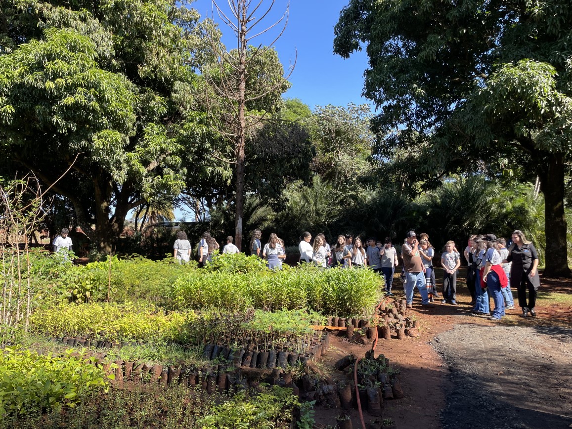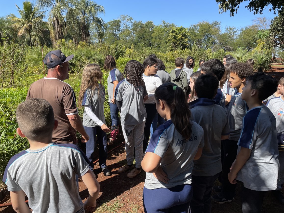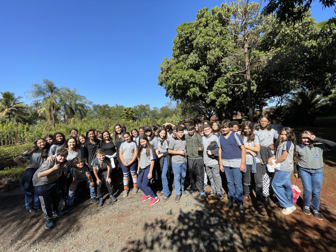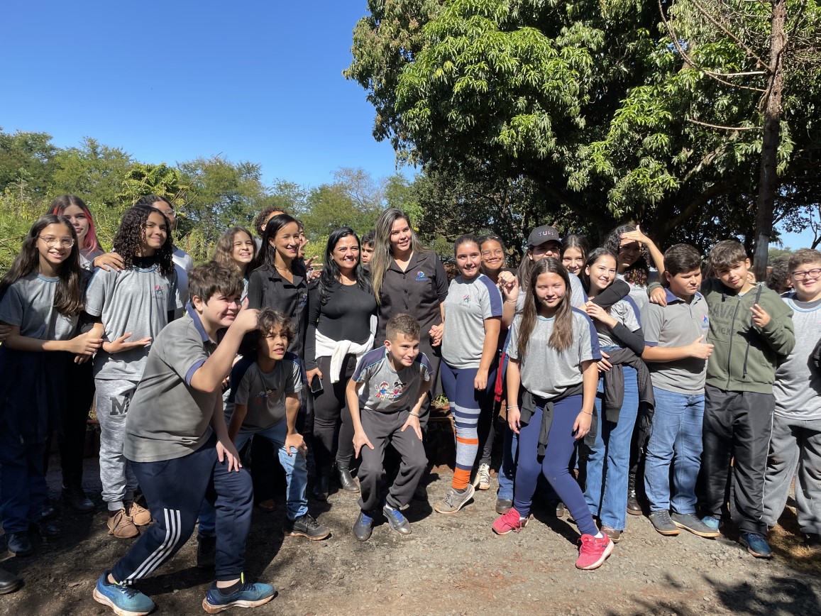 Durante a visita à lavoura, conheceram de perto a mecanização agrícola e viveiros de mudas de árvores nativas, um conteúdo importante que se somou ao que estão aprendendo na escola sobre recursos naturais, relevo da região, a predominância do tipo de solo, a exploração e espaço rural brasileiro, extrativismo e a agricultura.